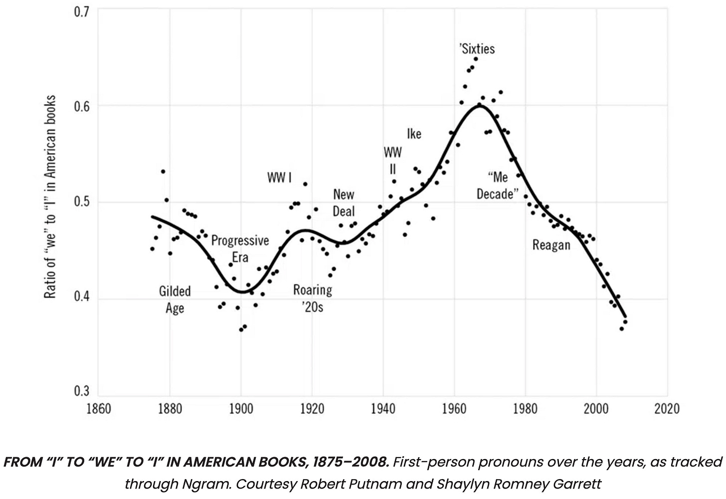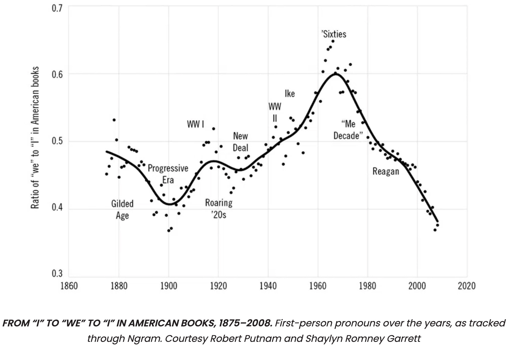 A compelling visual story: What happened to us? What happened to the “we”? Without knowing what n-grams are or ratios, the chart below tells a story that’s immediately accessible: we used to use the word “we” much more than “I.”