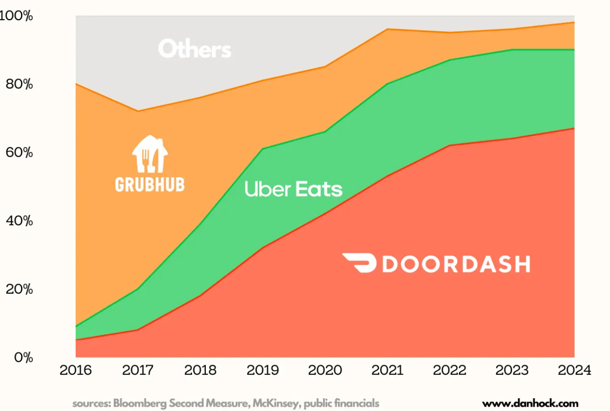 A compelling visual story. Why did DoorDash win? Area charts are great for helping people understand two things simultaneously: growth over time, and growth in comparison to others. In this chart we see: