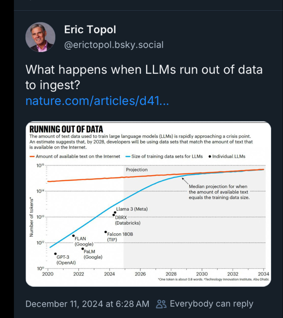 The post+chart below showed up a few days ago, saying that LLMs were running out of tokens — words — to learn from.